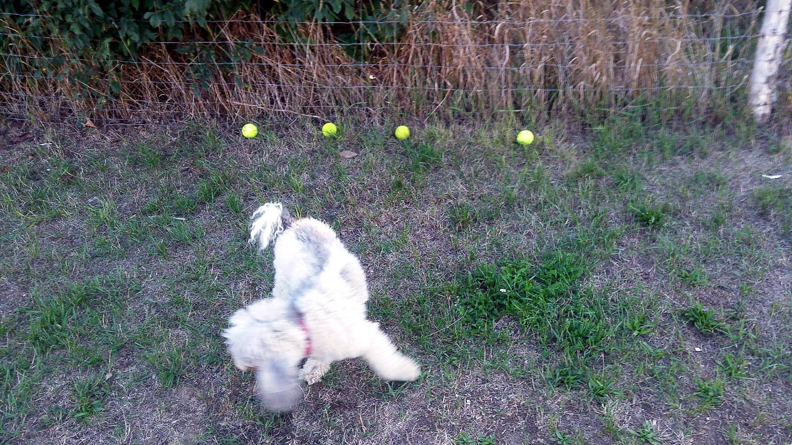 A páníček házel a Matýsek nosil další a další tenisáky a protože musel zase běhat pro ty nový, tak si je skládal do trávy - asi